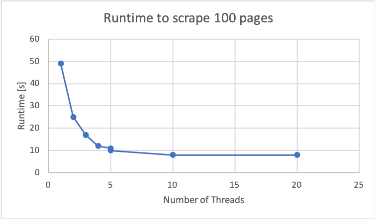 puts dataNow we are making multiple network requests at the same time with can get a total runtime closer to 9000*RTT/num_threads. Bear in mind this inverse relationship between number of threads and total time isn’t entirely accurate and you will reach a plateau. When I was scraping www.herpmapper.org/ for another project, I generated the following data: